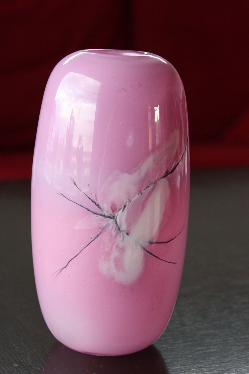 Den fine rosa vasen min, laget av Hadelandkunstneren Severin Brørby, og med kunstnerens signatur risset inn i bunnen, har fått plass på bordet (i alle fall fram til jentene kommer hjem!). Sånt kan man altså finne på Nattåpent i byen, hvis man tar seg tid til å titte innom noen av bodene man går forbi… 🙂